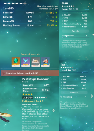 Using Prototype Rancour (because can increase her defense and attack really well). Her normal strikes generate a lot of healing(around 16-32% damage, right now I have 20%) also have a decent amount of physical damage(1000-3000 per hit). I mixed 2 parts of gladiator's finale and 2 parts of wanderer's troupe (peak 20k damage on crit with good reactions) About LVL 90 Vayuda Turquoise Gemstone (6) Hurricane Seed(20) Dandelion Seed(60) Ominous Mask(24) 120k mora - Adventure Rank 50