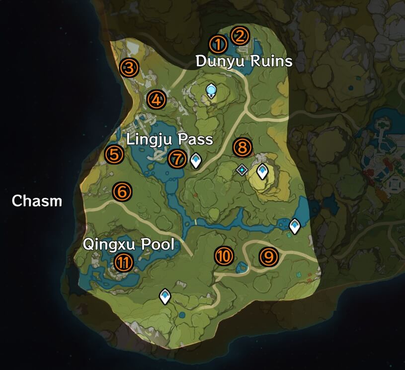 | Geoculus 99 | ![]() Location: On top of a broken bridge. Accessible by using Geo Elemental Skills to make stepping stones or gliding from the cliffs above. |