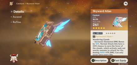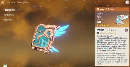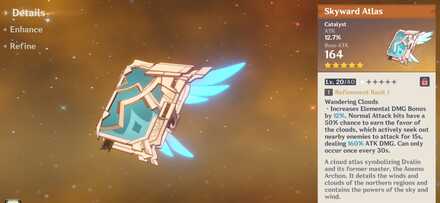 Wandering Clouds -Increases Elementals DMG bonus by 12%. Normal attack hits have a 50% chance to earn the favor of the clouds, whichs actively seek out nearby enemies to attack for 15, dealing 160% ATK DMG can only occur once every 30s