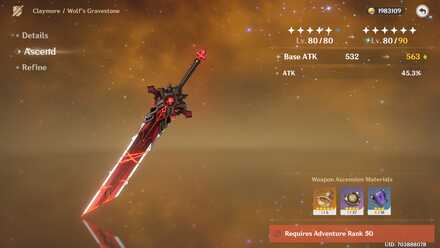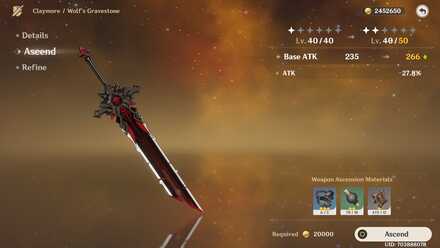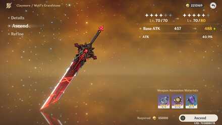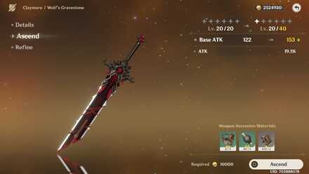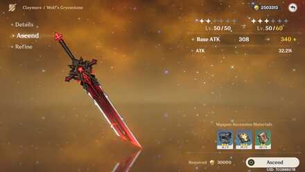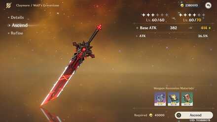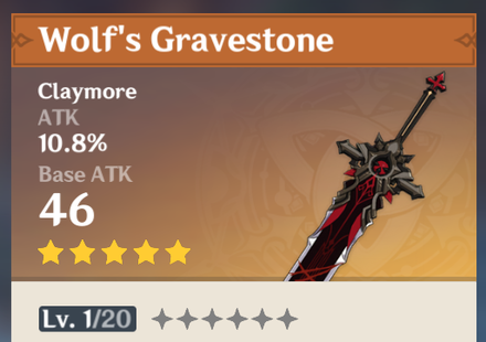 Basically its a heavy hitting weapon that focus on ATK and ATK only. 20% Increase ATK & plus 40% Increase ATK for all party member (Including the wielder) if you hit enemy that has less than 30% HP. The proc will triggered every 30s. You'll know when the weapon trigger the proc when you hear wolf howling and a small red wolf head above the wielder head As for Ascension Material Dandelion Gladiator Shackles Chaos Device/ Circuit/ Core Divining / Sealed / Forbidden Curse Scrolls