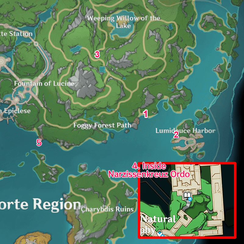 | 1 | ![]() At the tip of a cliff south of Starfell Lake, overlooking the Whispering Woods and Mondstadt City. |
