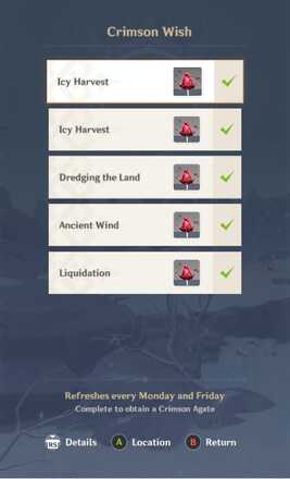 That's a bad guide, also there are chest with Crimson Agate also you need to complete two world quest on Dragonspine for two extra agate, at the end you need to raise the three to the lv when you unlock the Crimson Wish, to get the last levels you need to complete five events (per day?) to get 5 dialy agate.
