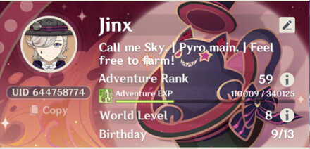 If any small/new players on the American server need help farming bosses and high level domains that you’re too weak to farm by yourself but you want the higher quality rewards they grant, feel free to friend me! My in game name is Jinx. My user ID is 661812382