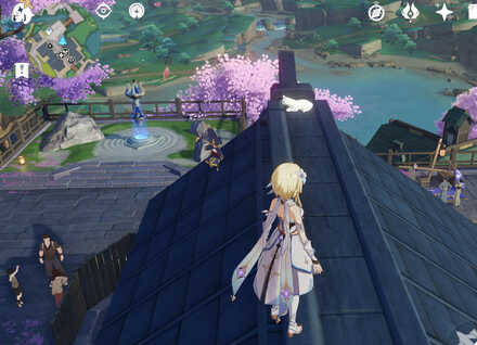 On the roof of the building across from Aoi’s Tsukumomono Groceries in Inazuma there usually a white cat