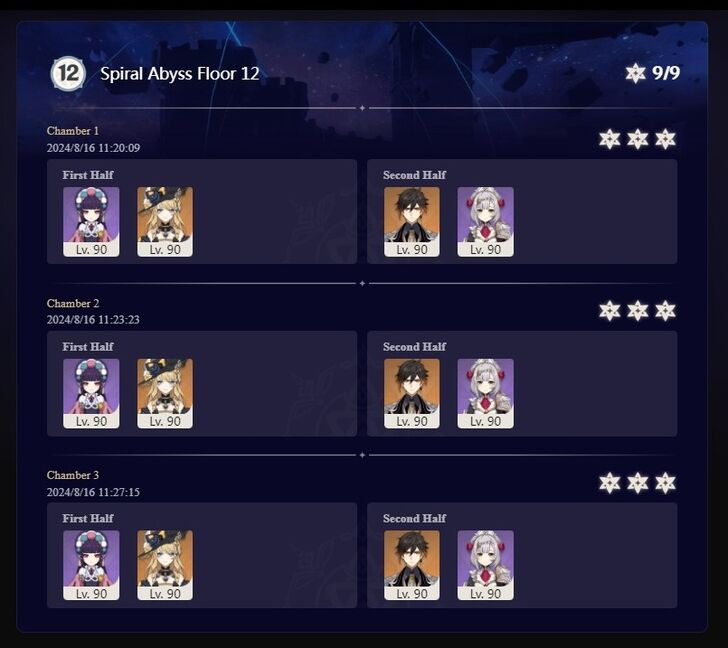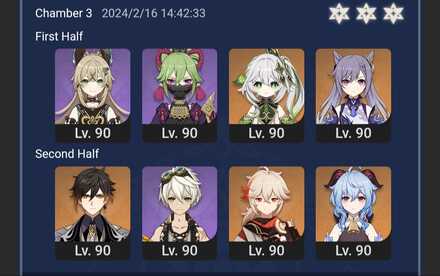 My team was: 1st Chamber: Neuvillette (C1), Kazuha (C0), Albedo (C0) (just for the geo interaction), Fischl (C6) 2nd Chamber: Raiden (C2), Nahida (C2), Yelan (C0), Zhongli (C1)