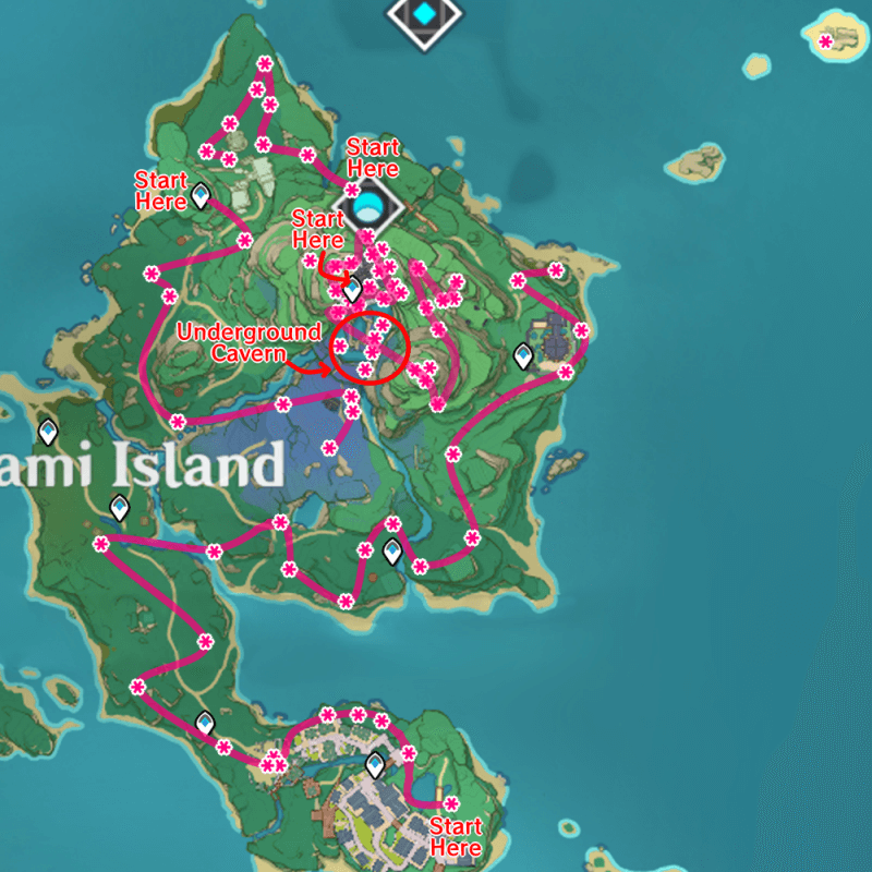 Start the Sakura Bloom Farming route at the teleport waypoints in Araumi or Grand Narukami Shrine, then make your away around the mountain. You can then begin the second route from Inazuma City.