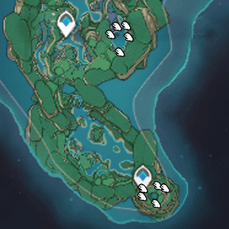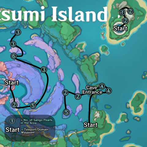 On Watatsumi Island, the Sango Pearl can be found near rivers and inside caves. Start by teleporting to the waypoint in front of the Sangonomiya Shrine, then follow the path marked on the map above.