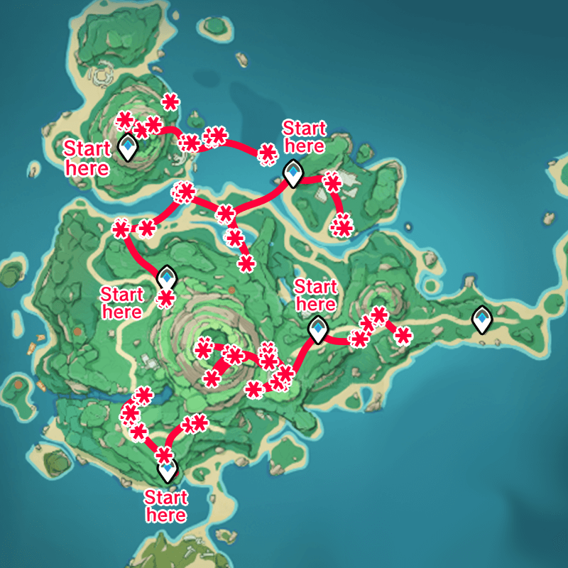 The farming route will start at the main Teleport Waypoints that divide the sections around Tsurumi Island. Note that the area to the northwest at Shirikoro Peak is underground and will need a puzzle to unlock.