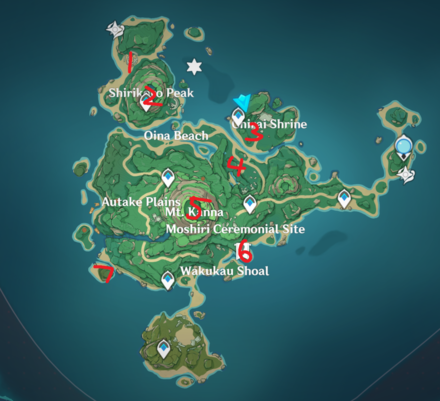 Autake Plains, underneath the "e' there was the one that was part of the story, can't remember if it gave a slate or not. Also one below the "m" in Moshiri Ceremonial Site, it's on the bit that hangs out, above the "o" in Wakukau Shoal. Another to the right of Mt. Kanna, above the teleporter. It's in that dark area with the water. You have to use the feather on one statue, then electro the ghost pillar that show up. The next statue will glow and repeat.