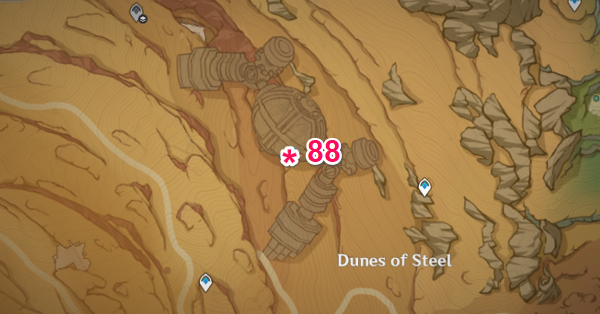 | 77 | ![]() Spincrystal 77 is found underground, on a giant gear right beside a Remarkable Chest. The cave entrance is by the right side of the giant robot in Devantaka Mountain, Sumeru. |