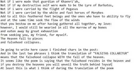 So i did a traslation with is pretty similar to the one that Alcyone posted but slightly different. The differences come from the italian translation of the poem: i compared them to their english counterpart and noticed that the italians one were slighty more "specific" i think? Anyway Morphes is someone we already heard of, or it could be the translation of Morpheus ?