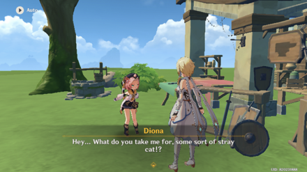 Diona part two: Lines Likes: "Mmm! I just wanna ask you this... Will you bring more of it next time?" Okay: "I'll admit that was pretty sweet... but that doesn't mean I haven't had sweeter." Dislikes: "Hey... What do you take me for, some sort of stray cat!?"