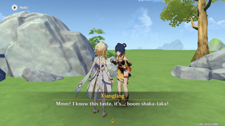 Xiangling part two: Lines “Mmm! I know this taste, it’s… boom shaka-laka!” “I gotta admit, you’re really good at cooking. Next time, it’s my turn to show you a thing or two.” “Are you sure you followed the recipe? Something is definitely off here…”