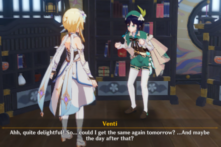 For Diona: "Hey... What do you take me for, some sort of stray cat!?" - Jewelry Soup, Vegetarian Abalone, Rice Buns "I'll admit, that was pretty sweet... But that doesn't mean I haven't had sweeter." - Noodles with Mountain Delicacies, Stir-Fried Filet, Mora Meat, Bamboo Shoot Soup "Mmm! I just wanna ask you this... will you bring more of it next time?" - Stir-Fried Fish Noodles, Mint Salad, Black-Back Perch Stew, Grilled Tiger Fish
