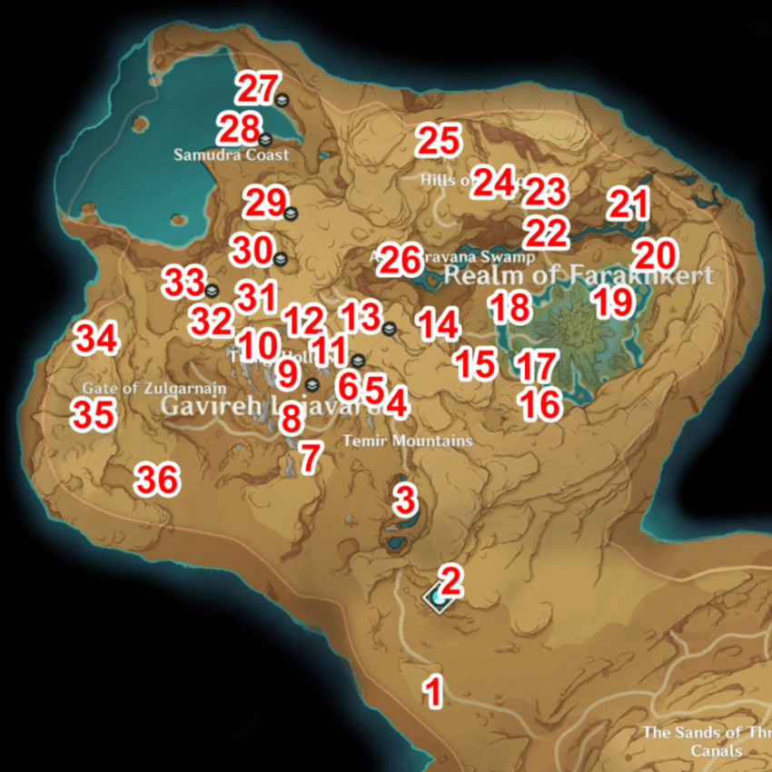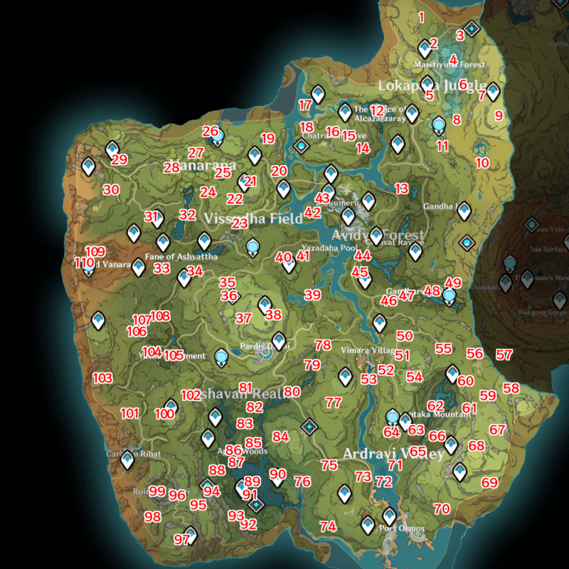 | Dendroculus 21 | ![]() Location: Located inside a cave southeast of Vanarana. You'll need to unflood the area by destroying two Withering Branches, then activating the Dendro Monument to reduce the water level. |