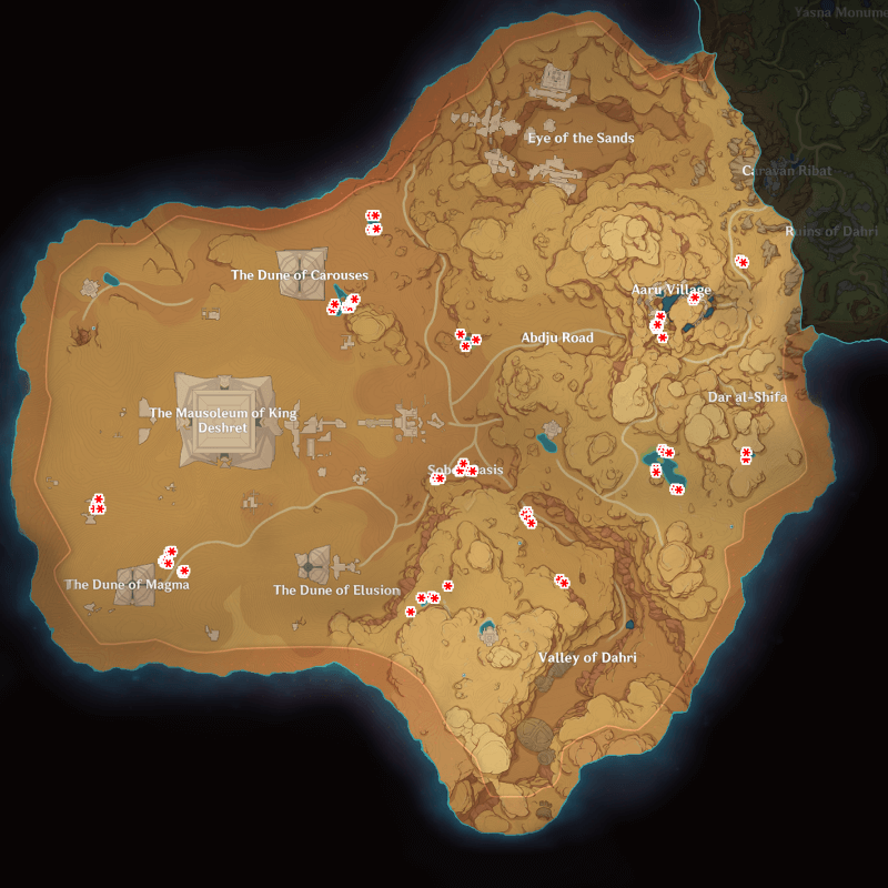 Ajilenakh Nuts are found exclusively in Sumeru's Desert Area on evergreen trees. The numbers indicate the quantity of Ajilenakh Nuts you can get per location!