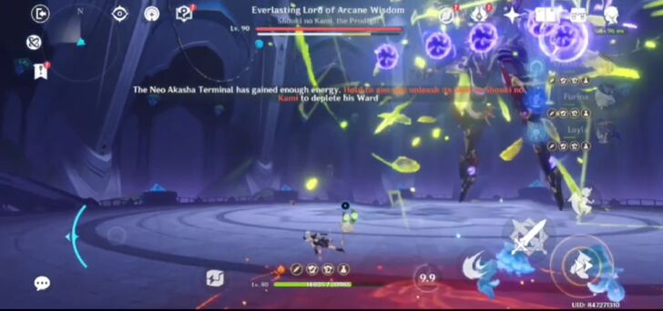 He also has OHKO mechanics like Raiden boss. After his shield broken, he will summon huge spirit bomb and four destructable robot that you must destroy them to recharge energy for Neo Akasha. He must attacked by fully-charged Neo Akasha before his bomb landed and OHKO the active character.