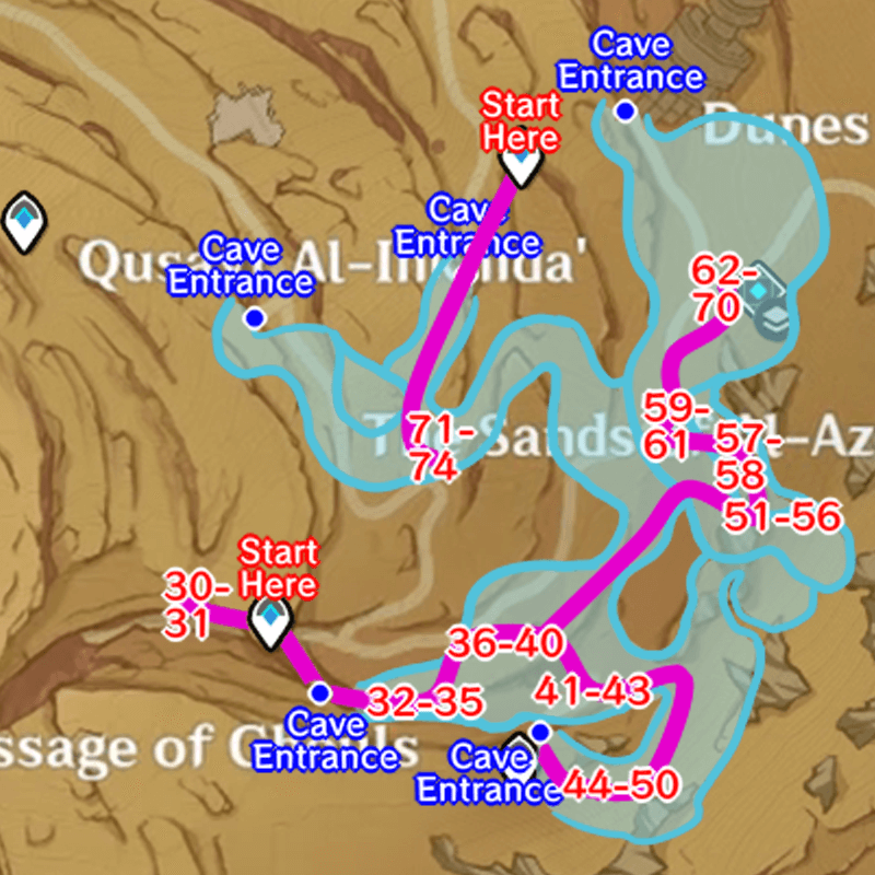 | 71-74 | ![]() Teleport to the Waypoint north of the Sands of Al-Azif and glide down to once again enter the Wenut Tunnels. You can follow the path until you come across the last four Sand Grease Pupas. |