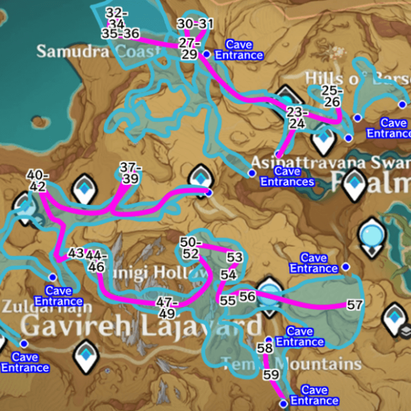 | 37-39 | ![]() Enter the cave from the teleport waypoint and find the cavern with the large spine-like gray crystals. Look for the hilichurl digging a rock pile and break the rock pile to reveal a Farrwick, which will lead you to a cave entrance. Head inside and follow the path to find 3 Mourning Flowers and a Dendroculus! |