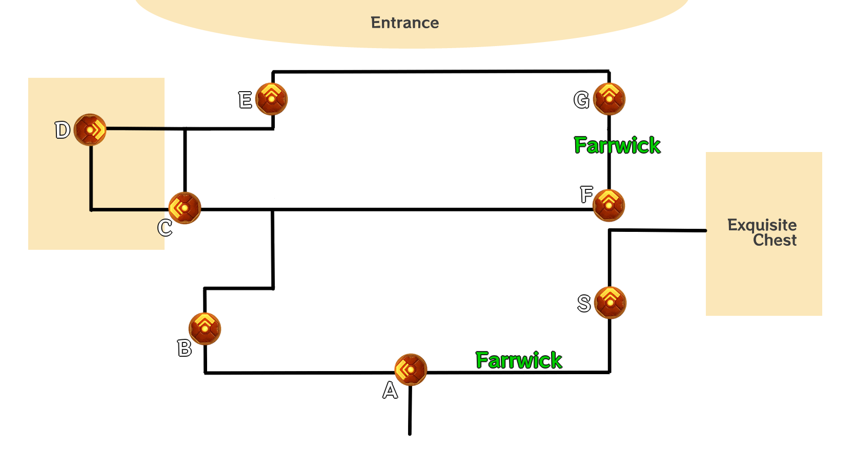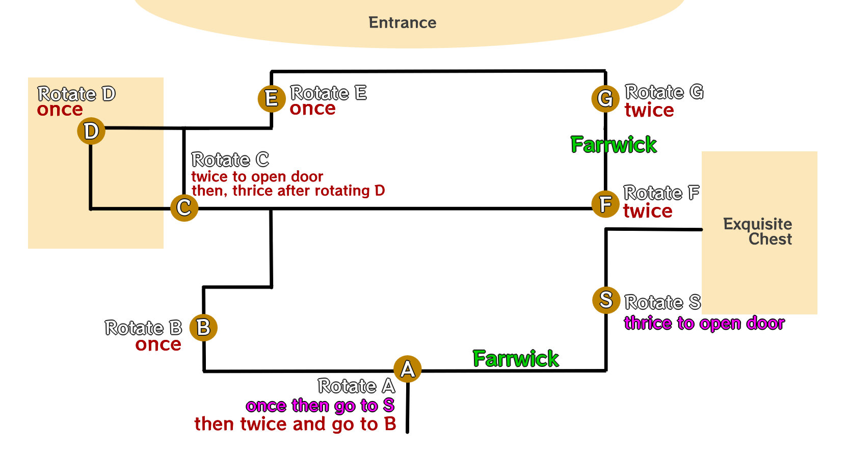 | A | Rotate Mixer A a total of three times. You have the option of rotating it thrice without stopping, or you can rotate it once, then rotate S thrice, get the Exquisite Chest behind the trap door, then back to Mixer A and rotating it two times. |