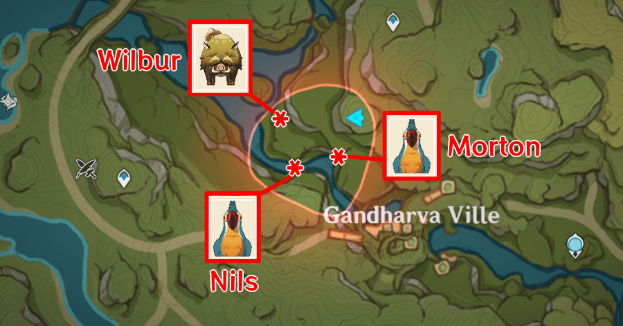 ![]() Morton the Dusk Bird is located on a large tree branch in view of Gandharva Ville! There will be Four-Leaf Sigils nearby. |