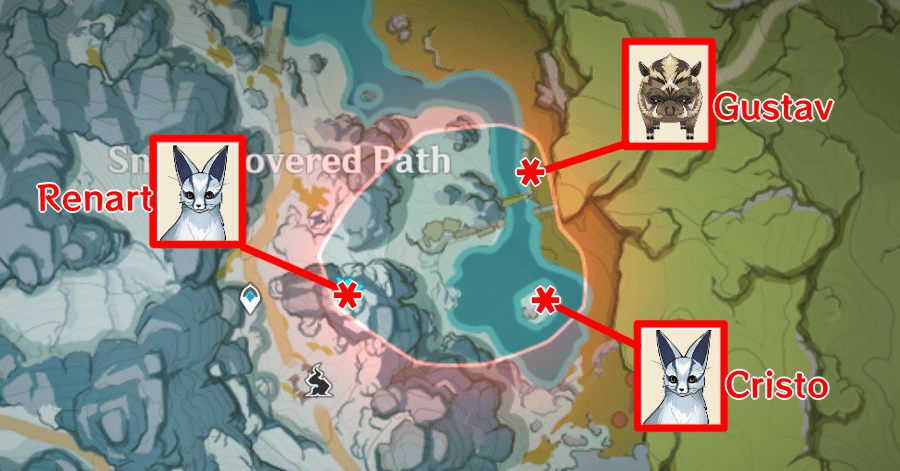 ![]() Ashe the Desert Fox is located inside the Hilichurl hut on the southwest side of the area, left of the oasis. |