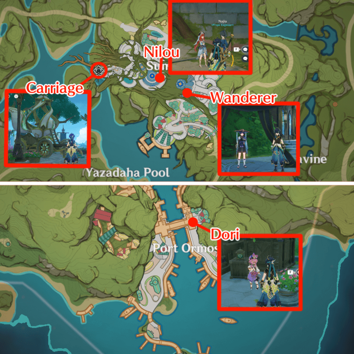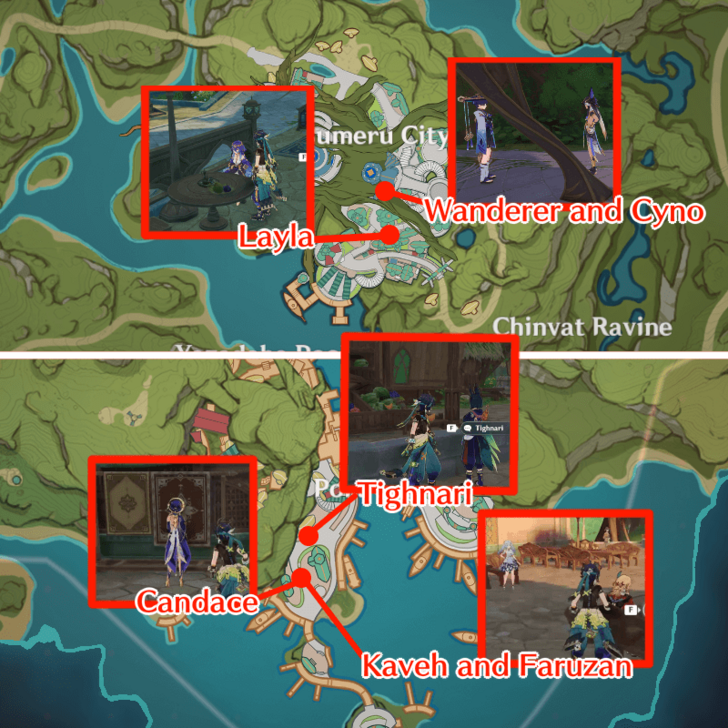 After completing the second event quest, Give Her Sweetness, Kaveh, Faruzan, Candace, and Tighnari will remain in Port Ormos, Layla can be found at Puspa Cafe, while Wanderer is joined by Cyno at the Akademiya.