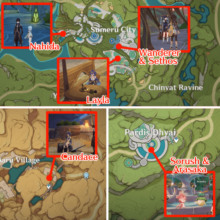 Wanderer will still be at the Akademiya, this time joined by Sethos, and Layla will be in her spot at the Puspa Cafe. Nahida can be found in front of the Sanctuary of Surasthana, and Candace is in Aaru Village.