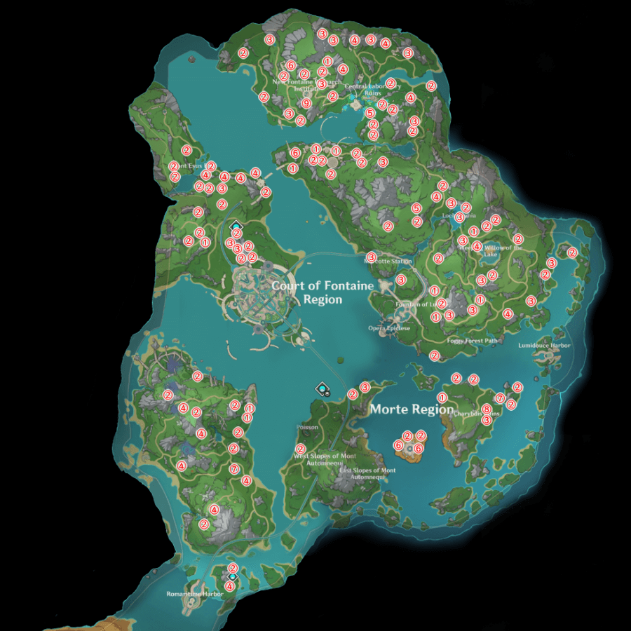 Can anyone update the map to have the locations for condessence crystal in all the regions of Fontaine? Currently you can only see them in the "Court of Fontaine" Region.