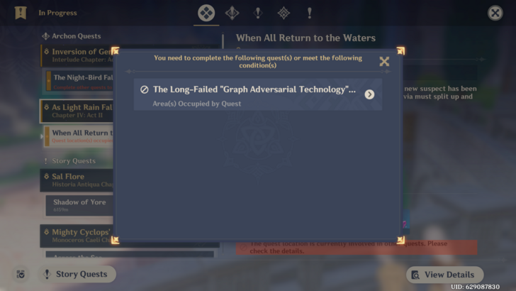 If you have this quest but haven't talked to Charlotte yet *and* haven't finished the Archon quest When All Return to the Waters, it will prevent you from completing that Archon quest. WHY they decided to lock an Archon quest by an Event added quest of no consequence is beyond me.