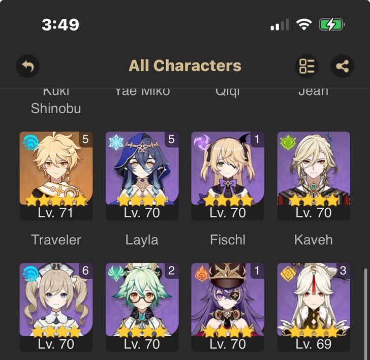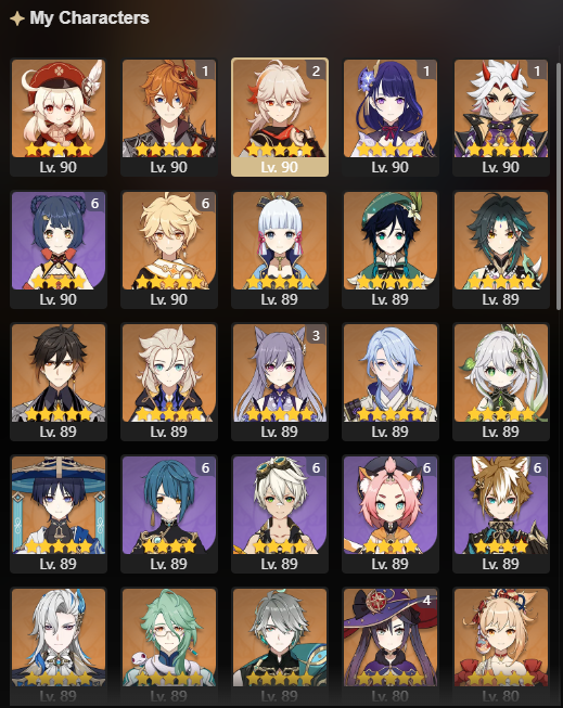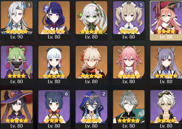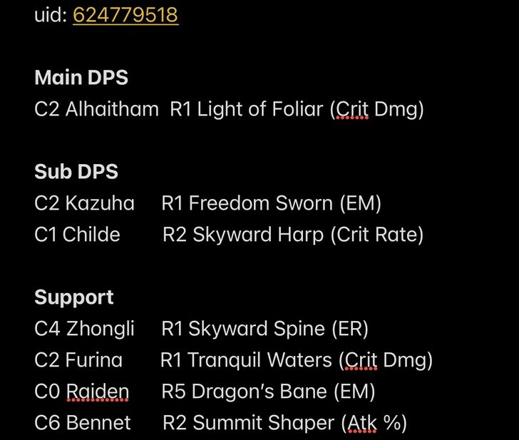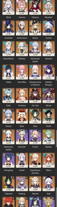 632077410 NA C2R1 Arlecchino 4p Fragment (working on talents, 9 NA but i went on haitus) C1R0 Furina on pipe or woolf fang depending on the time C1R0 Neuv C6 Bennet C6 Fischl on GT C0 Alhaitham usually built C0R1 Tighnari Like base 1000 EM Kuki Also C0 raiden and ayaka but theyre only build sometimes. Raiden is usually on em if you want that Some other random characters, those are just the notable ones