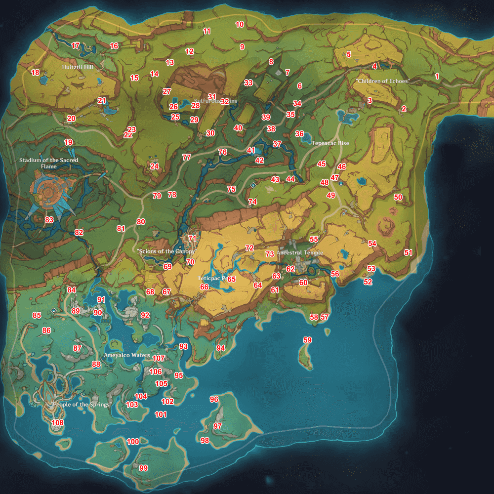 60 Pyroculus are found in the 5.5 areas of Natlan, which includes the Atocpan and the Ancient Sacred Mountain. 54 Pyroculus can be found in the Natlan 5.2 map, which covers the Tezcatepetonco Range, Quahuacan Cliff, and Ochkanatlan Region. While the 5.0 areas contained 108 Pyroculus.