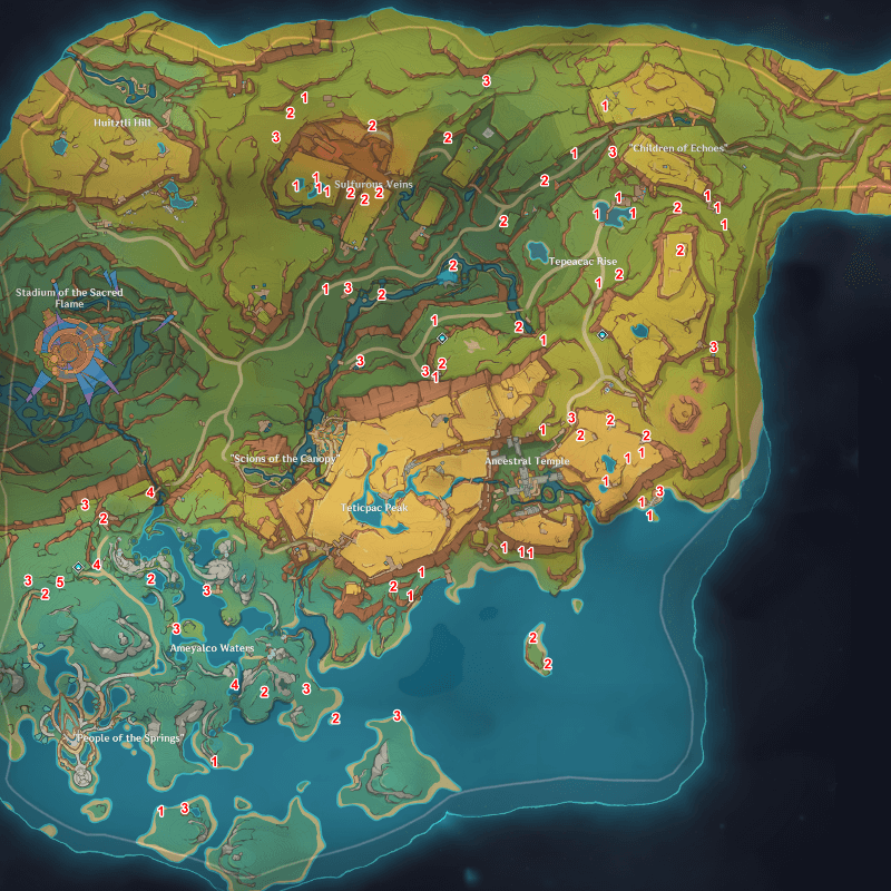 These Sauroform Tribal Warriors can be found around the region of Natlan. Do note that the numbers indicate how many Tribal Warriors can be found in each location.
