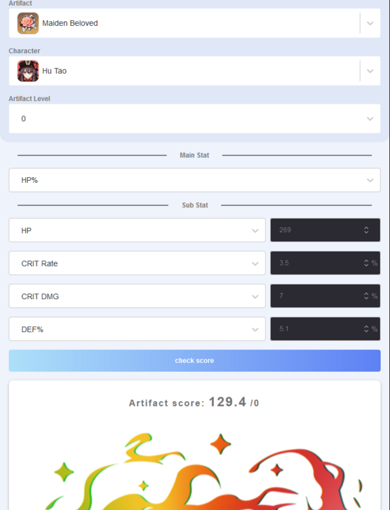 Very good but I think setting different value to differentiate between sands, circlets, and goblets in the calculations is a must for a future build. Especially since the current build of the score checker undervalues the main stats of sand pieces giving them a much lower rating than those of an optimal circlet or goblet.