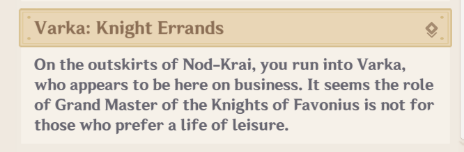 Varka appears near the Nod Krai Adventures Guild and by the bartender in the Flagship