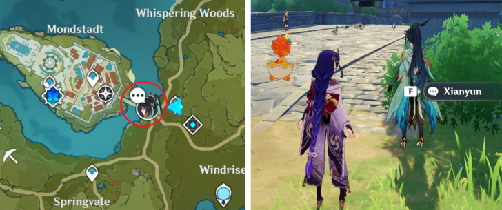 Found Xianyun's 3rd interaction at the entrance of Mondstadt next to Timmie's pigeons, make sure not to scare them away.
