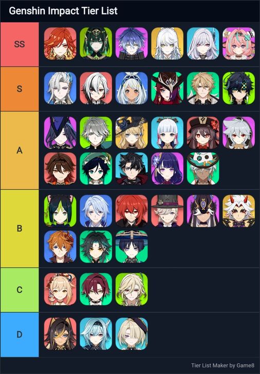 Main Changes between this list and my last one: Varka: Since his icon isn’t available right now, he will be placed as Number 27, between Xianyun and Fischl in S Tier. Arlecchino: S > SS Neuvillette: SS > S Gaming: A > S Venti: S > A Navia: S > A Hu Tao: A > B Diluc: B > C