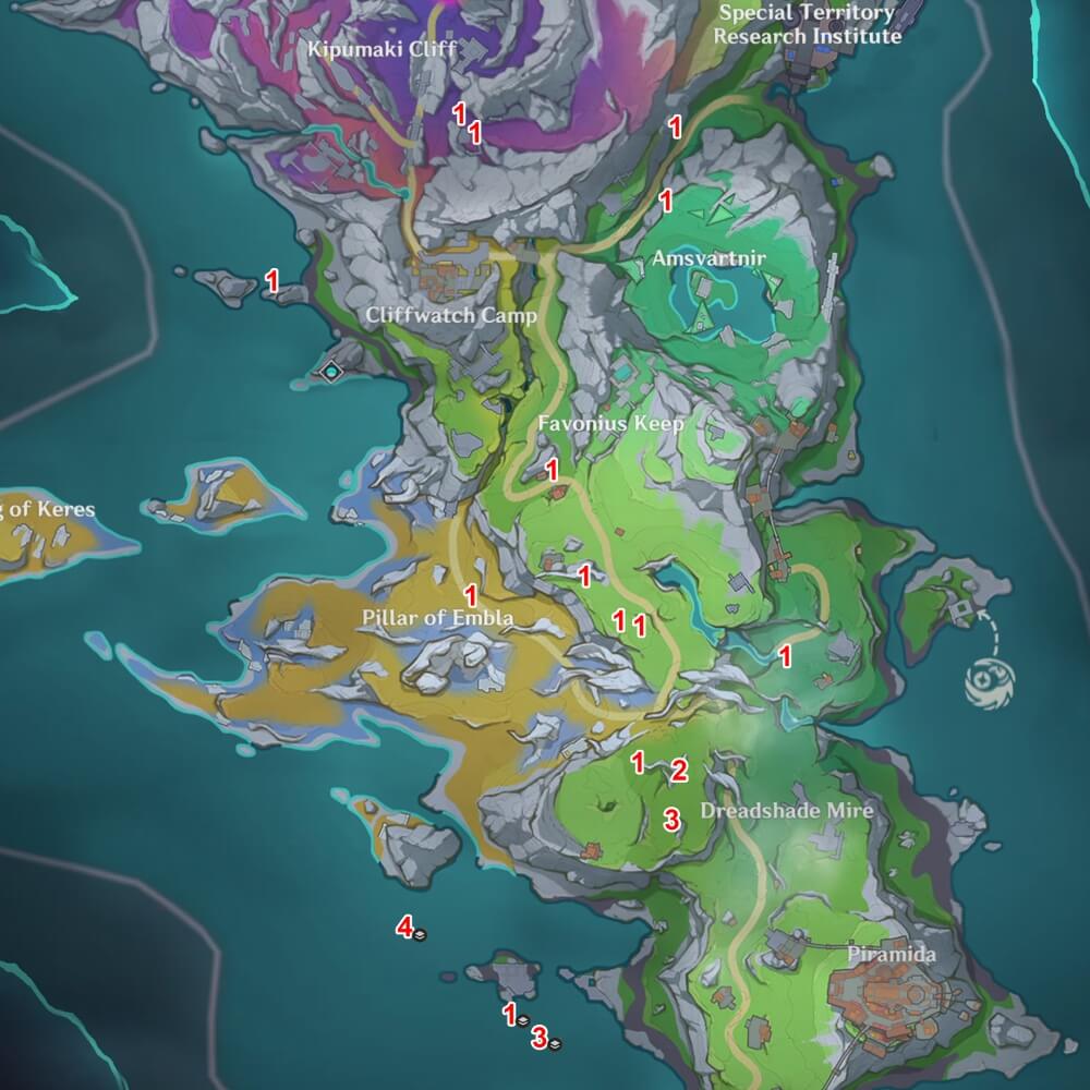 The map above shows the various Mandragora locations and how many of them you can find in each spot.