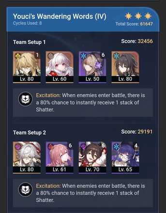 wtf, I used Luocha Tingyun Bronya Jingliu and Gepard Blade (yeah, I know, great combo) Xueyi and Ruan Mei and only managed to get 1 star on the third level and 0 on the fourth T-T