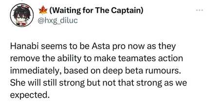 We’re still two months from release so I wouldn’t immediately say it’s joever. Of course they could still nerf her instead but we really have to wait until it’s actually a few days before release before deciding if she is bad like with Ruan Mei.