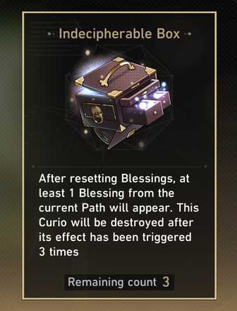 Indecipherable Box is the leveled up version of the Casket of Inaccuracy, it can be obtained through the Interastral Peace Mechanical Branch Shopping Mall (II) occurrence.