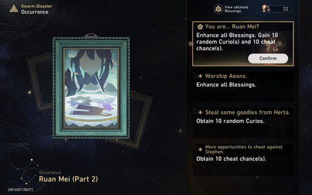 Hey, For Ruan Mei Pt. 2 you also can get 10 chances to cheat (if cheating is unlocked already I guess). Can be useful for some runs, eg Abundance 80 countdown runs. I ran into that event but my game is not in english, but there is proof here : https://www.youtube.com/watch?v=LSIqBtOHf2M Thanks for your extensive post, helps me loads !