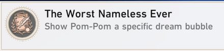 After everything's done and you get Hanu's Dream Bubble, go to Pom Pom and give for "The Worst Nameless" achievement