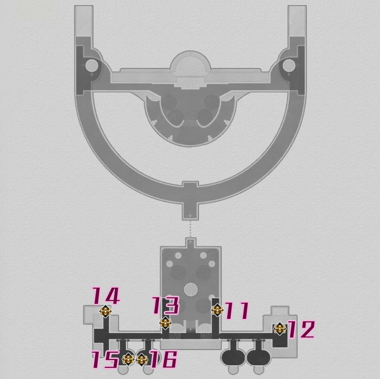After getting Chest 13, walk into the hallway on the left side of the map and reach the far end. Take a right turn and you will find the chest by a velvet rope barrier.