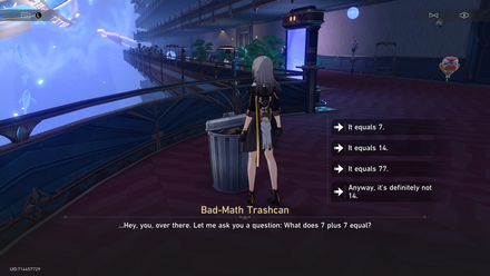 This is missing one trashcan in the Reverie dreamscape, the Bad-Math Trashcan. Answers: "It equals 77", "It equals 2"