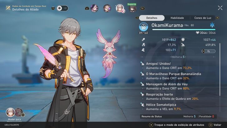 the RMC has a breakpoint if he hit 460% crit dmg in battle his buff will be the same of Broken Keel to team, but w more personal dmg It's possible via one of 4 ways: The Herta, Sparkle or Sunday or Bronya (harder) The Herta it's the best option since she gives the 80% to all and the other we need buff the RMC to hit this value to share with his kit I my RMC has 164 SPD and 264% off battle, here his status in battle, not using Hero set still farming, I am using 2 speed set+Banana