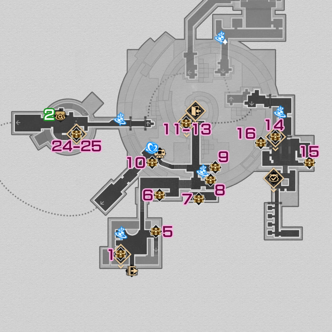 Wait for the the blue elevator platform to go down again and connect with the rest of the blocks at the bottom. This will trigger an explosion and reveal Chest 24 in the middle.