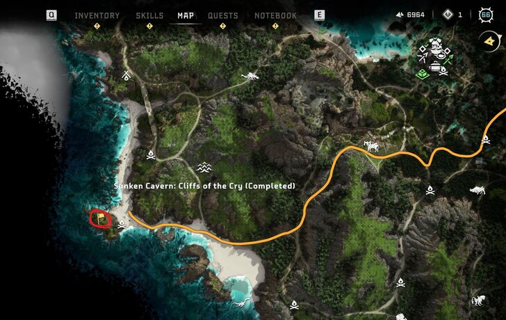 There is a greenshine cluster in the water directly west of the Long Coast Relic Ruins, and northwest of Thornmash. It is found atop a ruined building sticking out of the surf. You can see the building on the map.