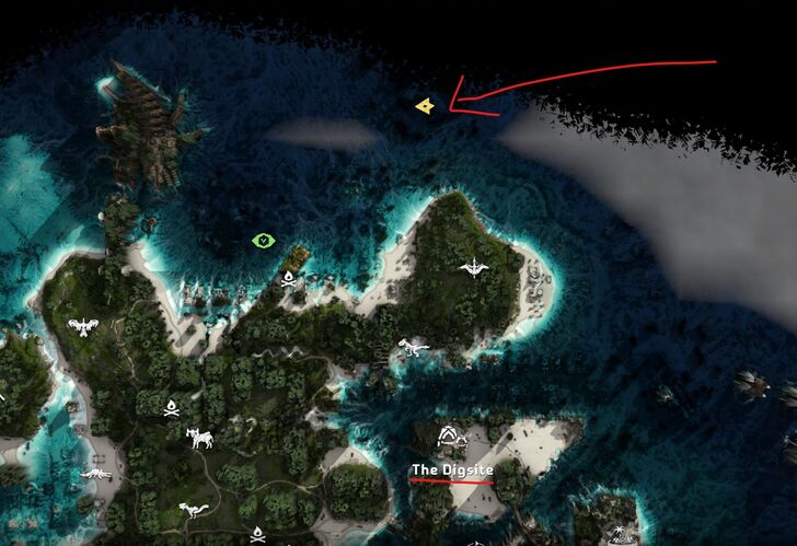 There's a greenshine cluster and a datapoint called 'LIVE@ALCATRAZ' in ocean directly north from the DIG SITE in isles of spire (screenshot attached for help)