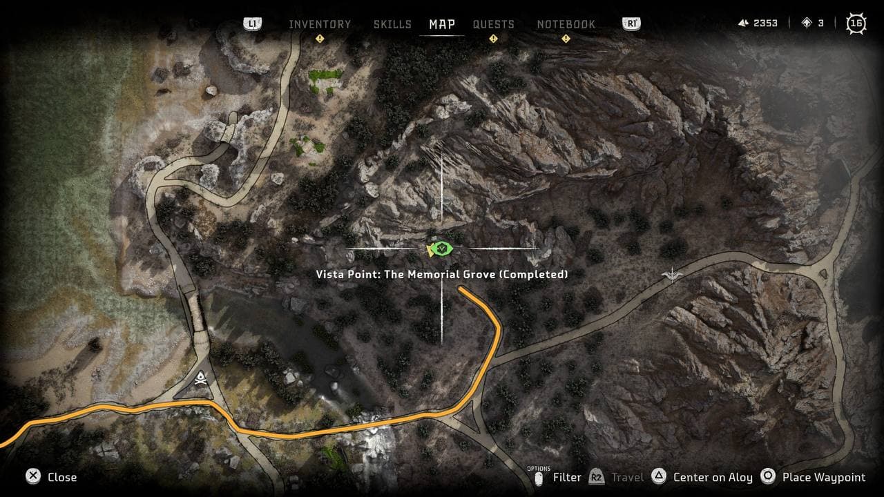 | 1 | ![]() Along the road north of The Memorial Grove you'll find another Vista Point Tower marked as a ? on the map. Scan the pulse to receive the parital Holo. |